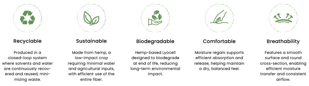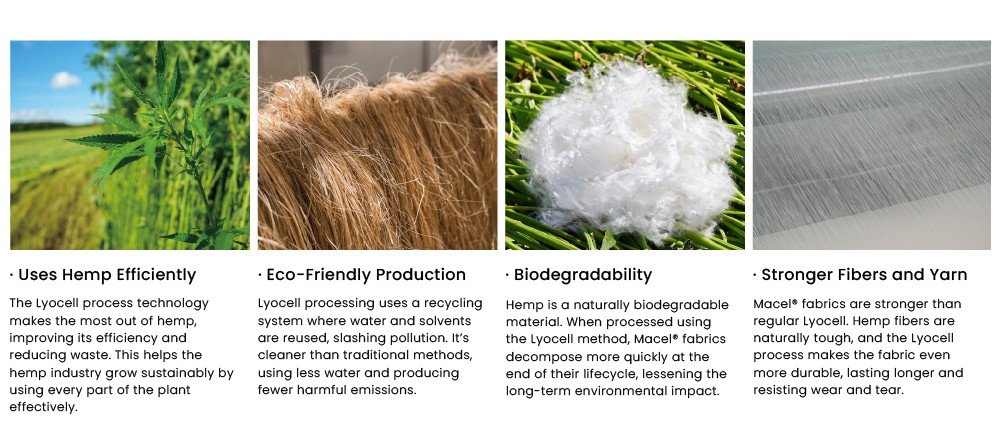 Macel®'s hemp-based composition provides a unique advantage in terms of environmental sustainability. Hemp is one of the most eco-friendly fibers, requiring minimal water, pesticides, and synthetic fertilizers to grow. By using hemp as its primary raw material, Macel® not only reduces reliance on tree-based fibers but also promotes sustainable farming practices. The natural resilience and strength of hemp, paired with advanced Lyocell processing, create a durable and biodegradable fiber. This innovation helps close the waste cycle and lessens long-term environmental harm.